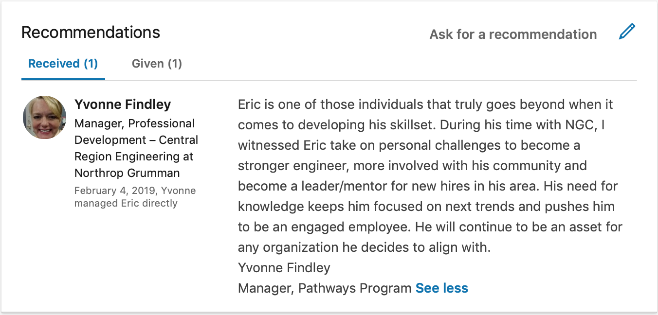 When someone writes a recommendation for you, it appears on your LinkedIn profile. After talking to recruiters and managers, I learned that they read recommendations and they are very important. Similar to your LinkedIn profile, your recommendations should showcase your skills, and accomplishments. The best people to get recommendations from are teachers, managers, and peers.