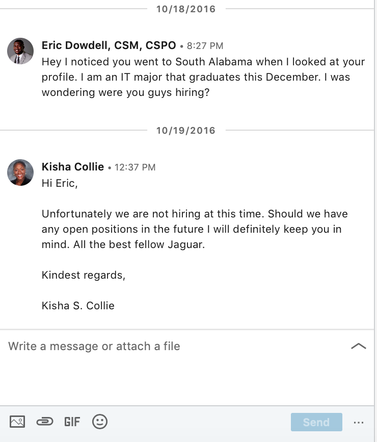 Here is an example of me reaching out to a fellow collegiate alumni about job opportunities. Even though there wasn’t any job opportunities available, I would have never known if I didn’t have the courage to reach out.